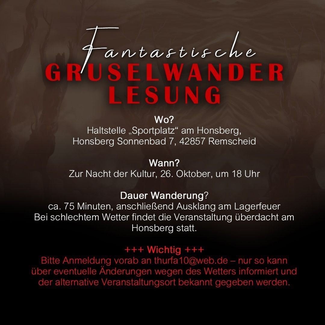 Wie klingt das? Spannend? Dann freut euch auf meine fantastische Gruselwanderlesung mit Nina Meiroth. Zur Nacht der Kultur am 26. Oktober entführen wir euch in die Remscheider Wälder.
